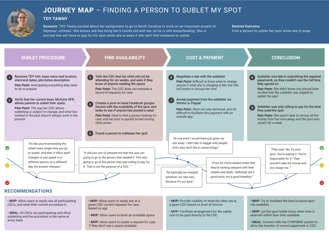 The biggest frustrations were A: finding a person to sublet/lease, and B: not having a trusted, sanctioned way to exchange payment for such a transaction. The Child Development Centers were mostly hands-off in these areas, leaving patrons to use social media or Craigslist to find and facilitate these arrangements.